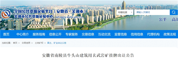 安徽省蕪湖市公共資源交易中心發布南陵縣牛頭山建筑用玄武巖礦掛牌出讓公告。該礦資源儲量8563.58萬噸,開采規模450萬噸/年,擬出讓年限19年,起始價84752萬元。掛牌時間2023年12月12日至2023年12月26日。