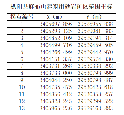 (四)開采面積及范圍:樅陽縣麻布山建筑用砂巖礦采礦權總面積1.9139平方千米(由13個拐點坐標圈定),具體范圍及拐點坐標如下(2000國家大地坐標系):
