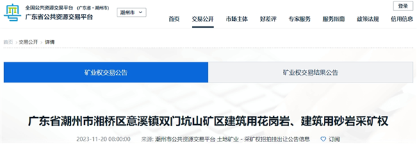 11月20日,廣東省公共資源交易中心發布潮州市湘橋區意溪鎮雙門坑山礦區建筑用花崗巖、建筑用砂巖采礦權掛牌出讓公告。該礦儲量共302.4萬方,出讓年限8.6年,生產規模30萬方/年,起始價1816萬元。