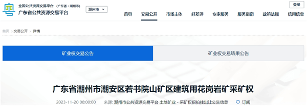 11月20日,廣東省公共資源交易中心發布潮州市潮安區若書院山礦區建筑用花崗巖礦采礦權掛牌出讓公告。該礦儲量共超3268萬方,生產規模150萬方/年,擬出讓年限14年9個月,起始價2.11億元。
