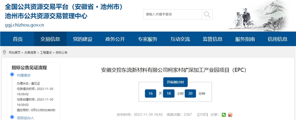 11月30日,安徽省池州市公共資源交易管理中心發布了安徽交控東流新材料有限公司柯家村礦深加工產業園項目EPC工程公開招標公告。項目招標控制價超13.5億元,建設周期215天日歷天,投標截止時間2023年12月21日9時。