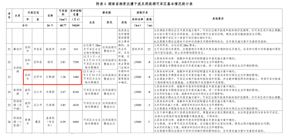 據悉,2023年9月,湖南省水利廳印發通知,正式發布《湖南省湘資沅澧干流及洞庭湖河道采砂規劃(2023~2027 年)》。《規劃》顯示,湖南省湘資沅澧干流及洞庭湖河道(2023~2027 年)共規劃26個采區,5年合計規劃開采河砂9.4269億噸(近10億噸)。其中,湖南環洞庭湖的常德、岳陽、益陽三大湖區市可采砂總量為9.3323億噸,占總規劃可采河砂的99%,預計帶來超過600億元的財政收入,將為環湖區城市帶來一筆可觀的收益。