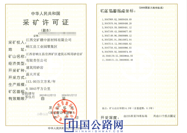 近日,江西交工礦業開發有限公司(以下簡稱“交工礦業公司”)峽江縣官洲礦區建筑石料用砂巖礦項目取得采礦許可證。