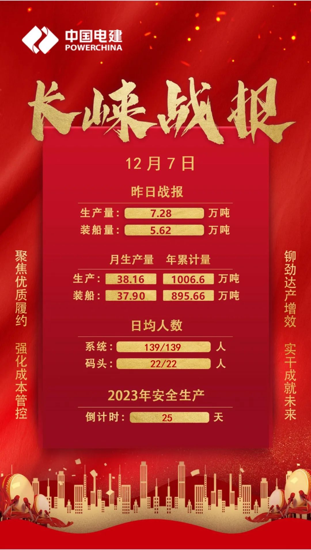 礦山和碼頭的各個角落。在8月9日“執(zhí)行實干、團結奮戰(zhàn),全員保穩(wěn)產(chǎn)、全力保銷售”動員大會上,長崍公司及項目各生產(chǎn)運行單位堅決表態(tài),堅定信念不動搖,凝心聚力向前沖,堅決打贏攻堅戰(zhàn),為工程局高質(zhì)量發(fā)展貢獻長崍力量!承擔粗碎重任的一工區(qū)不斷深挖設備潛力,精心維護、保養(yǎng)設備,使設備始終處于最佳狀態(tài)。11月初以來,日均產(chǎn)量穩(wěn)定在6.5萬噸左右,11月30日創(chuàng)造日產(chǎn)量7.65萬噸紀錄。