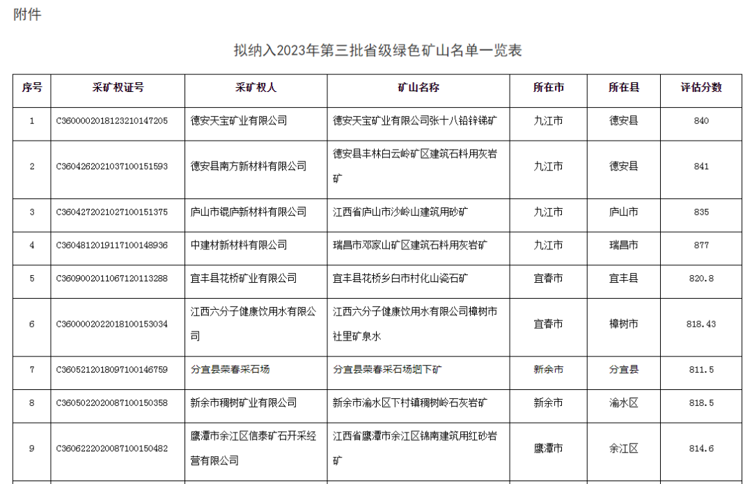 12月11日,江西省自然資源廳公布2023年度第三批省級綠色礦山擬遴選推薦名單,27座礦山企業達到相應綠色礦山標準,相關申報材料已上傳至江西省綠色礦山管理信息系統,擬納入2023年度第三批省級綠色礦山名錄。