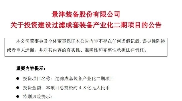 景津裝備表示,上述投資項(xiàng)目處于初始階段,尚未取得項(xiàng)目用地,尚未完成可行性論證及環(huán)境影響評價(jià)等工作,項(xiàng)目尚存在較多不確定性。公司將積極關(guān)注上述項(xiàng)目的進(jìn)展情況,并依據(jù)有關(guān)規(guī)定履行相關(guān)信息披露義務(wù)。