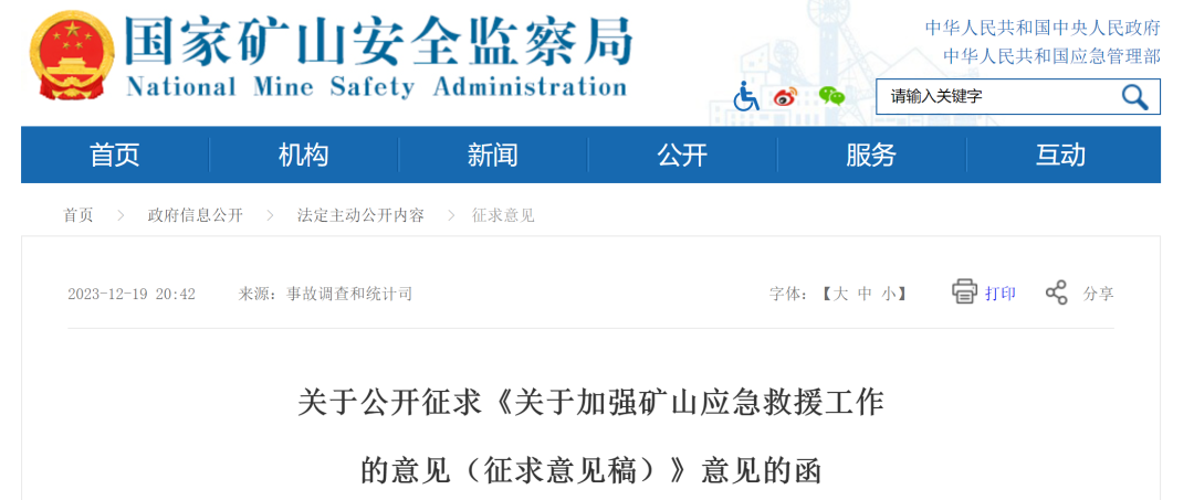 關于公開征求《關于加強礦山應急救援工作的意見(征求意見稿)》意見的函