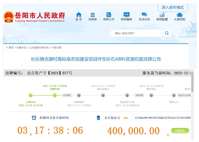 近日,湖南省汨羅市長樂鎮人民政府掛牌出讓長樂鎮合旗村高標準農田建設項目伴生砂石AB料資源,據了解,本次拍賣按單價起拍,起拍價為人民幣每噸33元。基礎設施、耕地渠溝恢復履約保證金200萬元,預付款200萬元,合計400萬元整。拍賣成交后,買受方負責伴生砂石AB料的采挖、裝載、運輸、銷售并承擔相關稅費繳納。