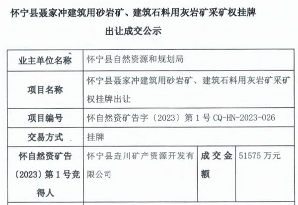 該礦資源量為4223.97萬方,生產規模為360萬噸/年,擬出讓年限為17.5年(含基建期2年),其中,建筑石料用灰巖礦礦石量987.12萬方(合2684.93萬噸)、建筑用砂巖礦礦石量1144.24萬方(2883.49萬噸);礦區范圍內的剝離物綜合利用資源量2092.61萬方本次一并出讓。懷寧縣垚川礦產資源開發有限公司以5.16億元(51575萬元)競得。