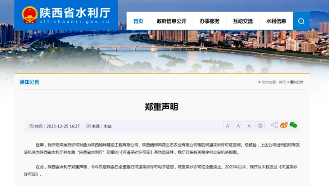 聲明中說,2023年汛后,陜西省已全面推行河道采砂許可電子證照,紙質采砂許可證全面廢止。2023年以來,陜西省水利廳從未核發過《河道采砂許可證》。