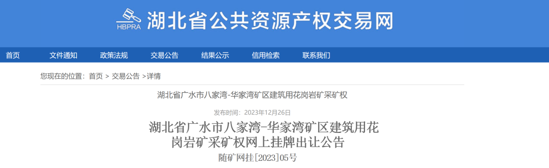 公告時間:2023年12月26日—2024年1月23日(20個工作日) 掛牌時間:2024年1月24日—2024年2月5日9時(10個工作日) 交易地點:隨州市公共資源交易中心。在湖北省公共資源拍賣交易網礦業權網上交易系統上進行,網上申請、網上報價和網上競價。