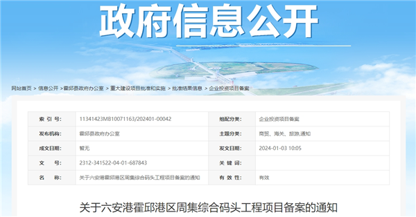 近日,安徽省六安市霍邱縣人民政府發布了六安港霍邱港區周集綜合碼頭工程項目備案的通知。據了解,該項目總投資30億元,擬建8個1000噸級泊位、10個1000噸級泊位,主要裝卸鐵精砂、鋼鐵以及建筑用骨料(機制砂)等,設計吞吐總量1880萬噸/年。建設單位為安徽港口運營集團(六安)有限公司。
