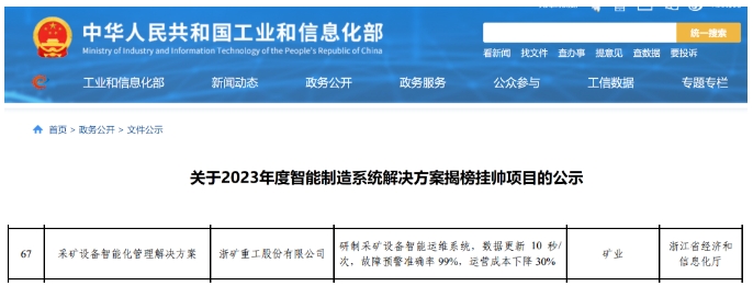 近日,工信部發(fā)布《關(guān)于2023年度智能制造系統(tǒng)解決方案揭榜掛帥項(xiàng)目的公示》。浙礦重工股份有限公司入選2023年度智能制造系統(tǒng)解決方案揭榜掛帥項(xiàng)目名單,揭榜項(xiàng)目為采礦設(shè)備智能化管理解決方案,任務(wù)內(nèi)容為研制采礦設(shè)備智能運(yùn)維系統(tǒng),數(shù)據(jù)更新10秒/次,故障預(yù)警準(zhǔn)確率99%,運(yùn)營(yíng)成本下降30%。