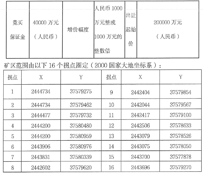 4、競買申請人須提供中華人民共和國境內銀行或其分支機構對競買申請人出具的人民幣100億元(含)以上的銀行流水證明(掛牌報價之日前1年內流水);或提供競買申請人在中華人民共和國境內銀行或其分支機構存款余額為人民幣300000萬元(含)以上的存款證明文件(掛牌報價之日起1年內有效)三、本次采礦權網上競價方式出讓按照價高者得原則確定競得人四、申請人可于2023年12月12日8時30分至2023年12月25日16時前,競買申請人可通過互聯網登錄陽江市土地與礦業權網上交易系統(https://jy.yjggzy.cn:8087/)或廣東省公共資源交易平臺交易系統(https://ygp.gdzwfw.gov.cn/ggzy-portal/#/441700/jyxt)申請參加競買,交納競買保證金到賬截止時間為2023年12月25日16時0分請錄網上交易系統詳閱“應用指南”悉知相關的網上交易程、保證金繳納等操作方法。