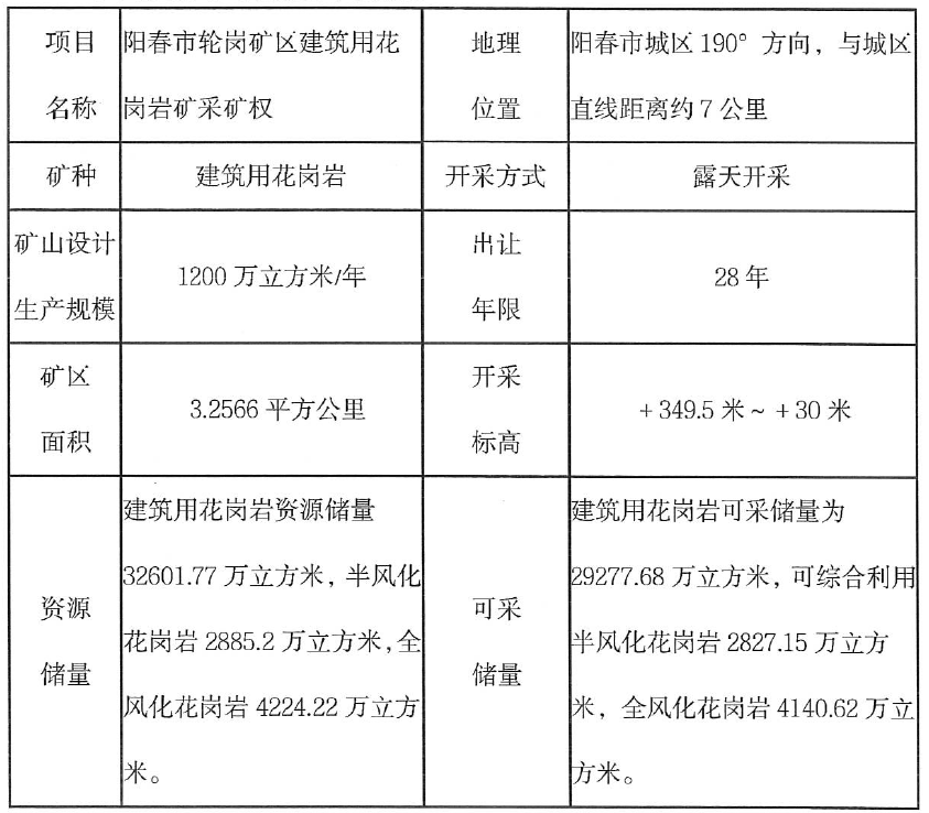 陽春市白然資源局委托陽江市公共資源交易中心以網上競價方式掛牌出讓1宗位于陽春市輪崗礦區建筑用花崗巖礦采礦權。現將有關事項公告如下: