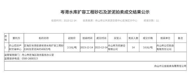近日,浙江舟山岑港水庫擴容工程砂石料及淤泥拍賣會在舟山市公共資源交易中心定海區(qū)分中心舉行,拍賣會現(xiàn)場競拍人爭相舉牌激烈競價,最終以1468.80萬元的總價成功拍出,溢價448.80萬元,溢價率達44%。