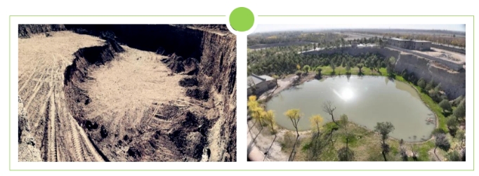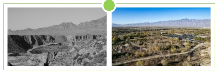 鎮北堡礦區位于賀蘭山東麓沖積扇扇緣區,是當地砂石料供應地。因開采歷史較長,人工采挖活動強烈,地上采挖區成面狀和網狀分布,礦區地形地貌景觀和生態環境被極大破壞,廢棄礦坑密集,地表形成了平均深達40米的礦坑,土地損毀面積15平方千米以上,礦區土石大面積裸露,現場滿目瘡痍與蕭瑟。受采砂影響,周邊植被稀疏,野生動植物難覓蹤跡。汛期泥石流、崩塌等地質災害頻發,水土流失問題突出,冬春更是揚塵天氣的主要污染源,嚴重影響周邊群眾生產生活,很長一段時間被視為“農業禁區”,成為人跡罕至的廢棄地,毫無生態環境可言。