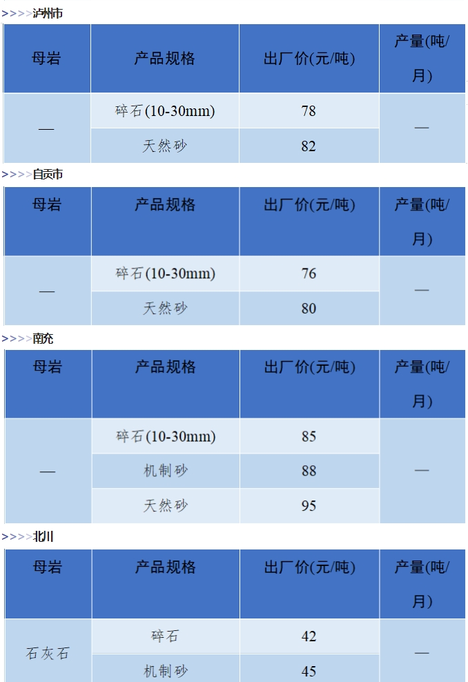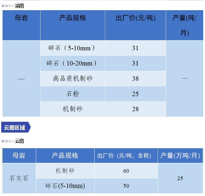 上漲 成都碎石77元/噸,上漲2元/噸,機(jī)制砂82元/噸,上漲2元/噸,天然砂82元/噸,上漲2元/噸。 甘肅天水市機(jī)制砂72.12(含稅),上漲11元/噸,碎石61.14元/噸,上漲6元/噸。 湖南長沙高標(biāo)碎石92元/噸,上漲3元/噸;機(jī)制砂85元/噸,上漲7元/噸。 長江沿線港口機(jī)制砂石、洞庭湖、鄱陽湖砂全線上漲,普遍漲幅在2-4元/噸左右。南京港天然砂(洞庭湖砂2.0-3.0)95-104元/噸,上漲5-8元/噸;南通長源(洞庭湖砂2.0-3.0)98-107/噸,上漲5-12元/噸。 下降 重慶渝東碎石(5-10mm)31元/噸,下降2元/噸;碎石(16-25mm)37元/噸,下降3元/噸;機(jī)制砂24元/噸,下降3元/噸,高品質(zhì)機(jī)制砂33元/噸,下降8元/噸。 重慶渝北機(jī)制砂48元/噸,下降6元/噸,高品質(zhì)機(jī)制砂54元/噸,下降6元/噸,碎石(5-10mm)45元/噸,下降6元/噸。 溫馨提示:部分價格為相關(guān)企業(yè)代表性價格,不代表當(dāng)?shù)仄骄鶅r格,價格僅供參考。 臨近年關(guān),部分礦山開始停產(chǎn)停運(yùn),除大型基建項目趕工外,其他項目已經(jīng)進(jìn)入收尾階段,北方部分項目逐步進(jìn)入“停工”階段,請相關(guān)企業(yè)關(guān)注砂石價格和市場走向,根據(jù)自身實際情況合理安排生產(chǎn)和采購任務(wù)。