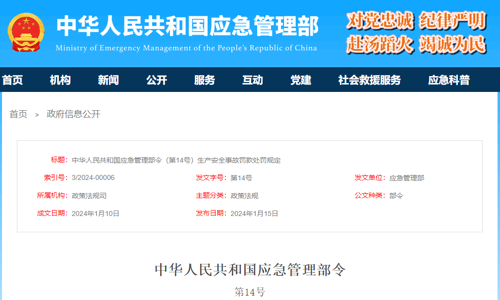 《生產安全事故罰款處罰規定》已經2023年12月25日應急管理部第32次部務會議審議通過,現予公布,自2024年3月1日起施行。
