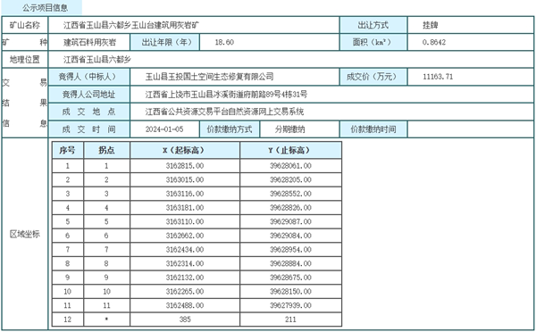 江西省上饒市玉山縣六都鄉玉山臺建筑用灰巖礦采礦權被當地國企拿下!該礦資源儲量3912.4萬立方米(105767.5千噸),可采資源量為10047.91萬噸,生產規模540萬噸/年,擬出讓年限18.6年,成交價約1.11億元(11163.71萬元),競得人為玉山縣玉投國土空間生態修復有限公司(國有企業),采礦權出讓收益采用分期繳納的方式。
