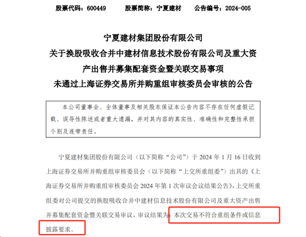 據(jù)悉,2023年8月,寧夏建材向上海證券交易所并購重組審核委員會提交的換股吸收合并中建信息及重大資產(chǎn)出售并募集配套資金暨關(guān)聯(lián)交易申請。2024年1月16日,寧夏建材發(fā)布公告稱,上交所并購重組審核委員會對本次申請審議結(jié)果為不符合重組條件或信息披露要求。現(xiàn)場,寧夏建材被問及吸收合并原因、財務(wù)回款及未來發(fā)展可行性等三個問題。