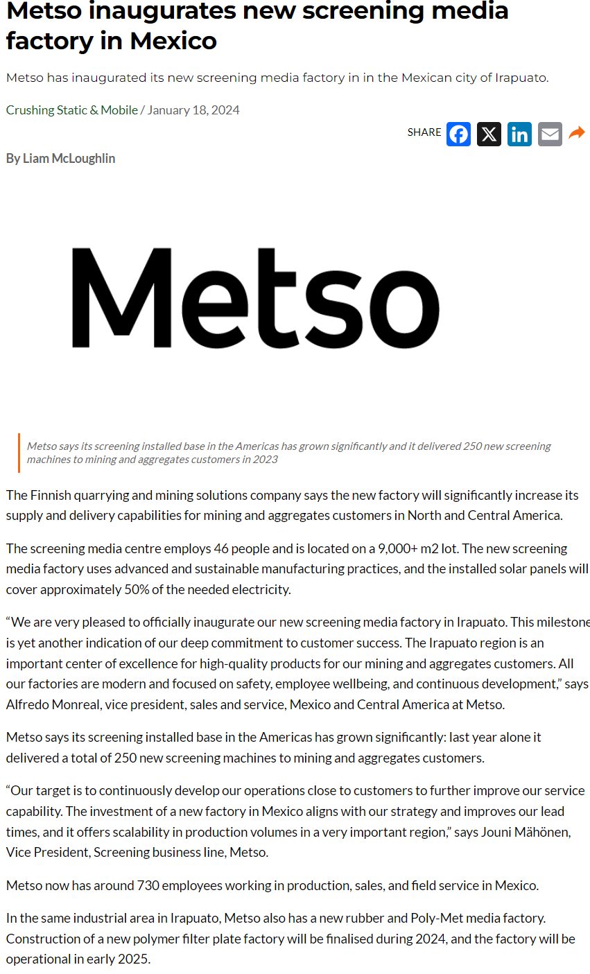 美卓是一家芬蘭采石和采解決方案公司。這家公司表示在墨西哥開始新的篩分工廠,新工廠將顯著提高其對北美和中美洲采礦與骨料客戶的供應和交付能力。