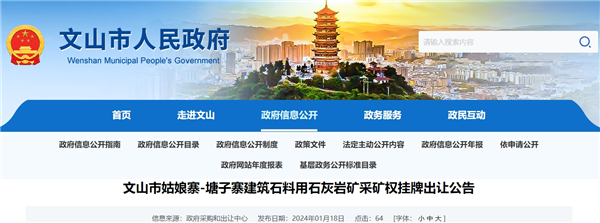 近日,云南省文山市人民政府發布文山市姑娘寨-塘子寨建筑石料用石灰巖礦采礦權掛牌出讓公告。該礦資源儲量超1.3億噸,生產規模500萬噸/年,出讓年限22年,起始價約1.2億元。掛牌時間2024年2月23日至2024年3月8日,不接受聯合競買。