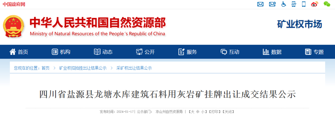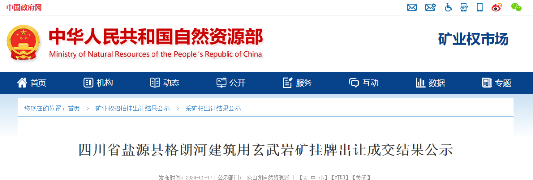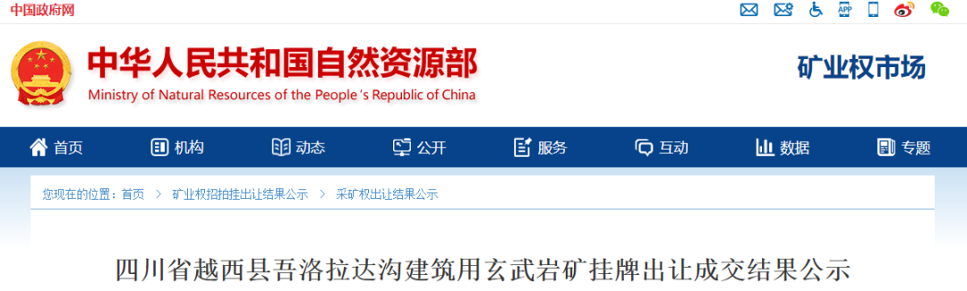 據了解,近日,四川省涼山彝族自治州涼山州自然資源局發布公告,以掛牌的方式出讓越西縣吾洛拉達溝建筑用玄武巖礦、越西縣哈木建筑用白云巖礦、鹽源縣龍塘水庫建筑石料用灰巖礦、鹽源縣格朗河建筑用玄武巖礦4宗采礦權,礦產資源儲存總量超3億噸,四宗礦權總成交價39810萬元。