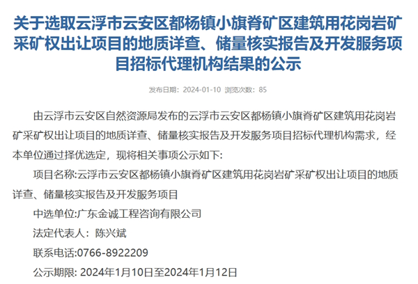 1月10日,廣東省云浮市云安區自然資源局發布消息稱,云浮市云安區都楊鎮小旗脊礦區建筑用花崗巖礦采礦權出讓