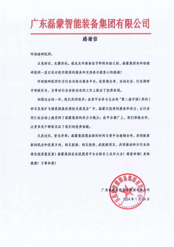 近日,環(huán)球破碎機(jī)網(wǎng)收到廣東磊蒙智能裝備集團(tuán)有限公司感謝信。信中,磊蒙集團(tuán)對環(huán)球破碎機(jī)網(wǎng)過去一年的工作表示了肯定和感謝。