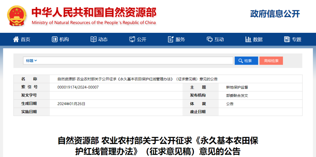 2024年1月26日,自然資源部 農業農村部發布關于公開征求《永久基本農田保護紅線管理辦法》(征求意見稿)意見的公告。征求意見稿第十七條提到: