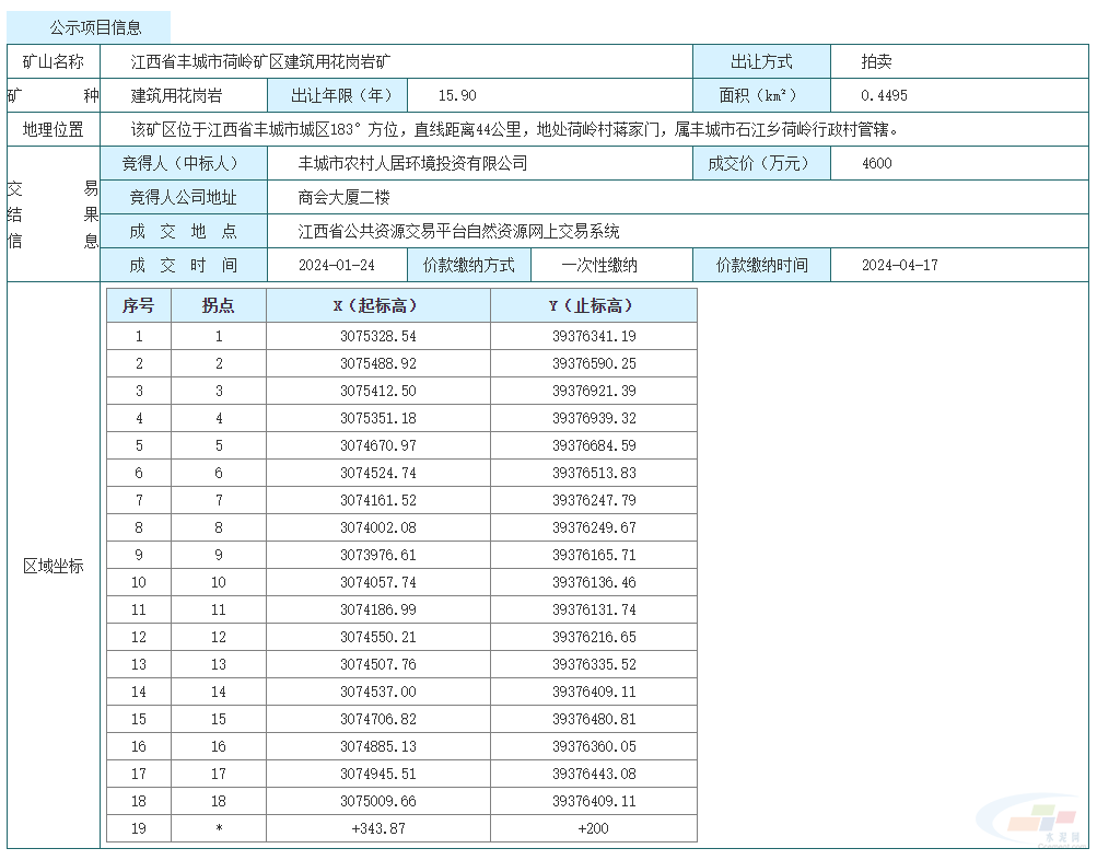1月24日,江西省豐城市荷嶺礦區建筑用花崗巖礦采礦權成功出讓,擬出讓15.9年,起始價4500萬元,豐城市農村人居環境投資有限公司以4600萬元拿下,溢價100萬元。