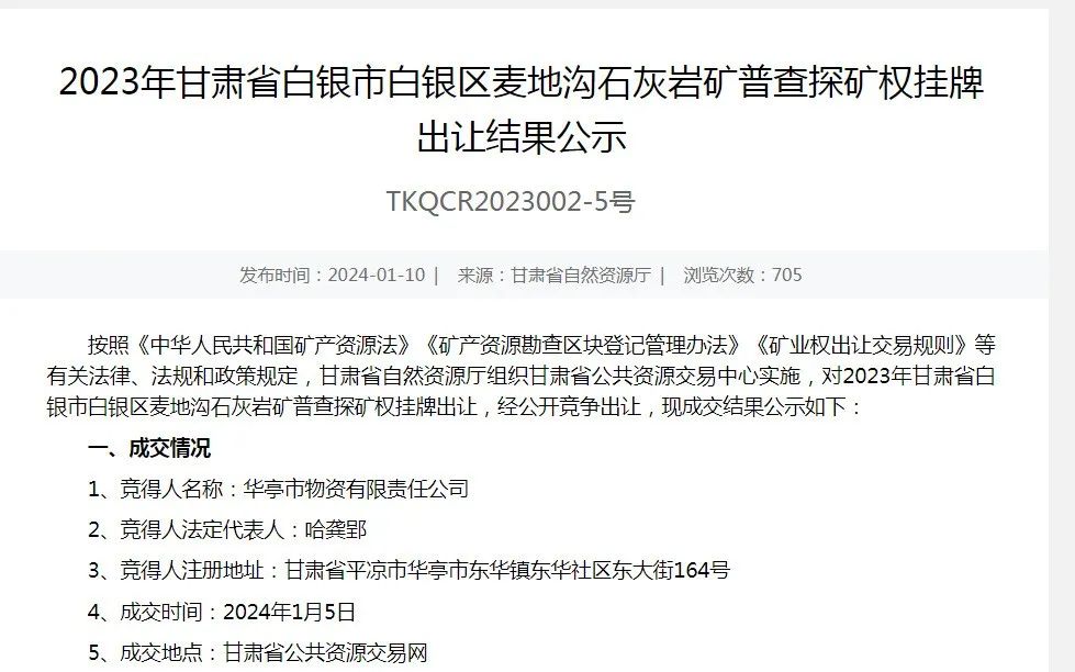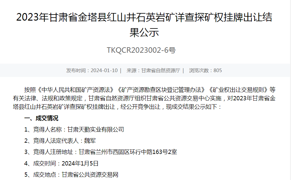此次公開掛牌出讓的礦業權主要有永登縣大有煤礦、肅北縣牛圈子四號煤礦北礦區、岷縣三溝金礦詳查、徽縣東坡鉛鋅礦普查、臨澤縣小孤山蛭石礦普查、肅北縣公婆泉煤礦、白銀市白銀區麥地溝石灰巖礦普查及金塔縣紅山井石英巖礦詳查等。