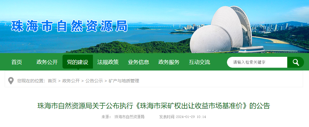 《珠海市采礦權出讓收益市場基準價》已經市政府批準同意,現予公布,自公布之日起施行。
