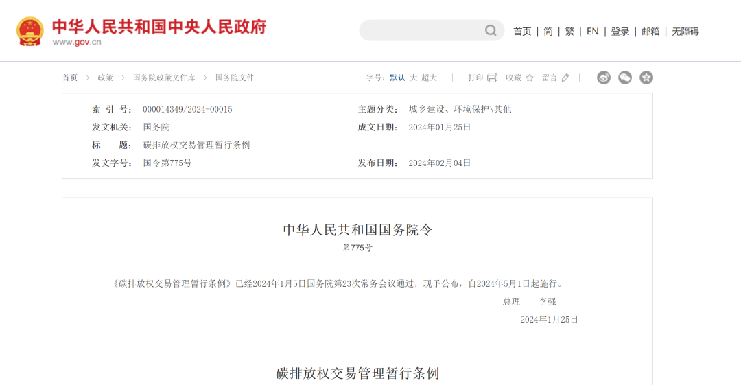 《碳排放權(quán)交易管理暫行條例》已經(jīng)2024年1月5日國務(wù)院第23次常務(wù)會議通過,現(xiàn)予公布,自2024年5月1日起施行。