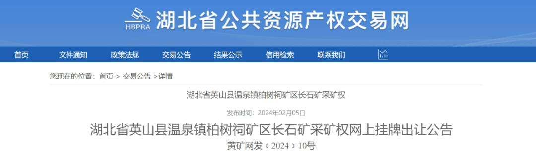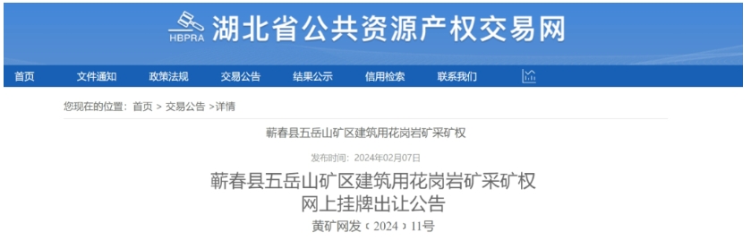 該礦位于英山縣溫泉鎮柏樹祠村,礦區面積0.35平方公里,開采礦種為長石礦、建筑石料礦(建筑用花崗巖、建筑用片麻巖)。礦區范圍內資源儲量共4840.1萬噸(建筑用石料礦資源量4801.3萬噸,長石礦38.8萬噸),生產規模484萬噸/年(建筑石料礦480萬噸/年、長石礦4萬噸/年),出讓年限10年,起始價8337萬元。網上掛牌起止時間2024年3月9日-2024年3月25日。