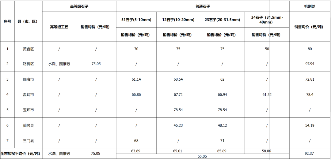浙江臺州市發布2024年1月全市在采經營性建筑用石料區域礦產品價格信息匯總表,普通石子平均價格為65.06元/噸,機制砂平均價格為92.37元/噸。其中普通石子最高價格為玉環市78.54元/噸,機制砂最高價為路橋區97.94元/噸。