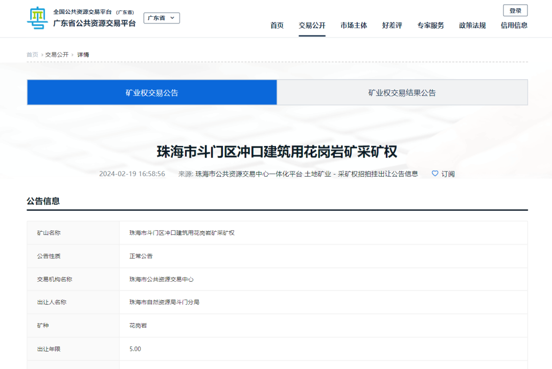 近日,珠海市公共資源交易中心以網上掛牌的形式出讓珠海市斗門區沖口建筑用花崗巖礦采礦權。該礦權位于珠海市斗門區白蕉鎮北西343°方位,生產規模不低于200萬m³/年,可開采儲量721.53萬m³,出讓年限為五年,起始價為3800萬元。