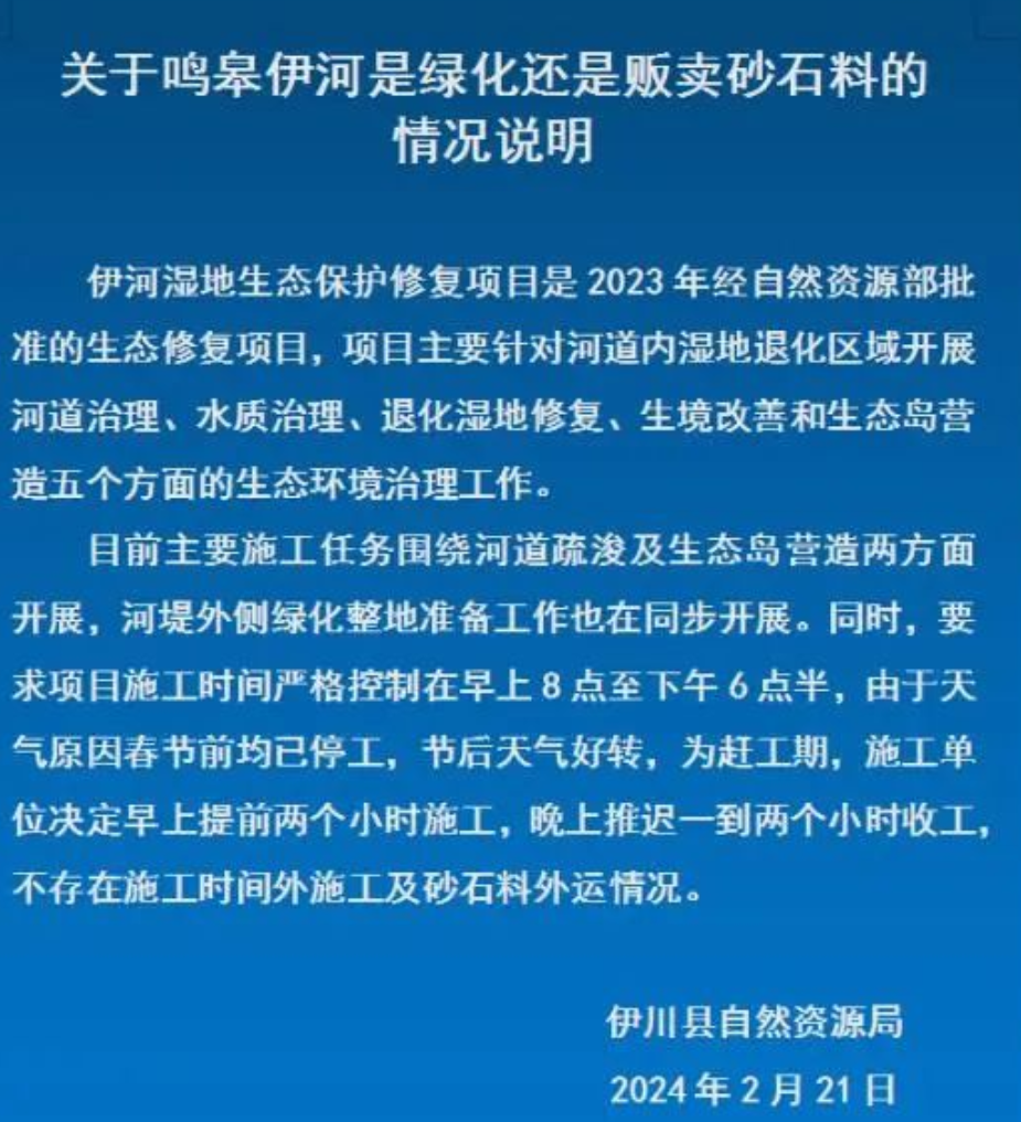 據河南洛陽市伊川縣官方微博消息,2月21日,伊川縣自然資源局發布關于鳴皋伊河是綠化還是販賣砂石料的情況說明:伊河濕地生態保護修復項目是2023年經自然資源部批準的生態修復項目,項目主要針對河道內濕地退化區域開展河道治理、水質治理、退化濕地修復、生境改善和生態島營造五個方面的生態環境治理工作。