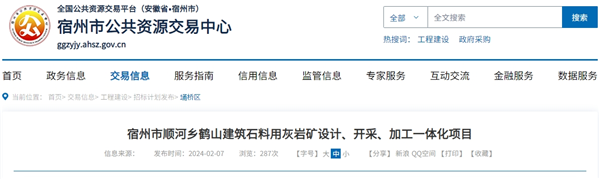近日,安徽省宿州市公共資源交易中心發布順河鄉鶴山建筑石料用灰巖礦設計、開采、加工一體化項目招標計劃。該項目投資金額35億元,計劃2024年3月招標。