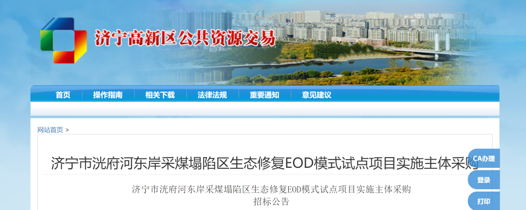 據了解,2023年3月3日,山東政府采購網發布濟寧市洸府河東岸采煤塌陷區生態修復EOD模式試點項目實施主體采購招標公告,項目總投資約46億元。