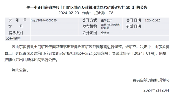 2024年1月19日,該礦被費(fèi)縣自然資源和規(guī)劃局公開掛牌出讓;2024年2月20日,費(fèi)縣自然資源和規(guī)劃局宣布中止該礦掛牌出讓。