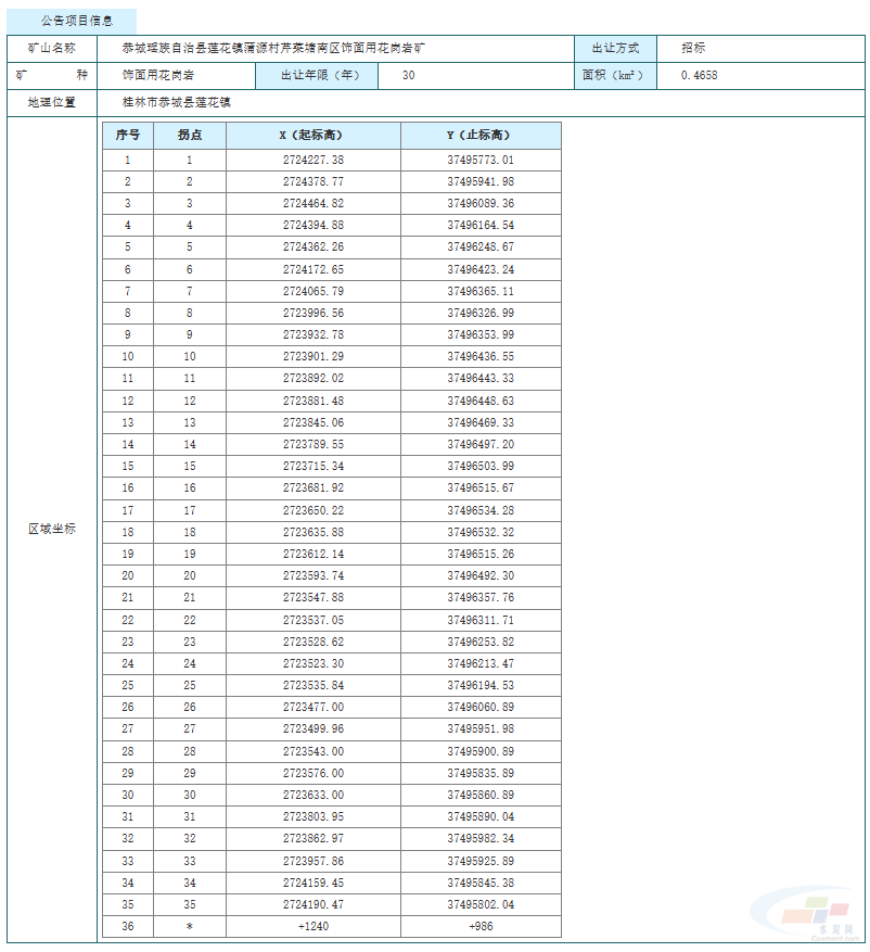 3月1日,桂林市自然資源局與桂林市公共資源交易中心聯合發布公告,招標出讓廣西恭城瑤族自治縣蓮花鎮蒲源村芹菜塘南區飾面用花崗巖礦采礦權,擬出讓30年,起始價1.5億元。
