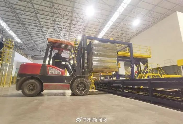 2月27日,武安新峰循環經濟產業投資發展有限公司工作人員用叉車將水泥免燒制磚成品運下運輸線。