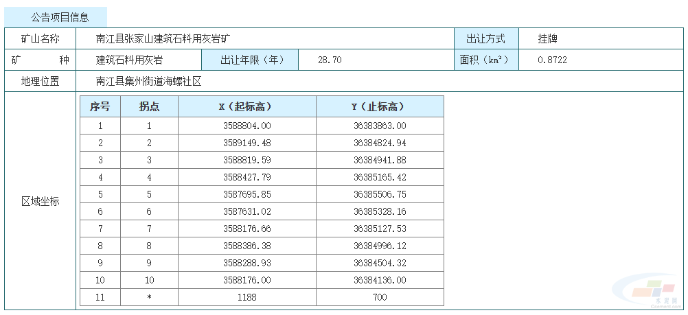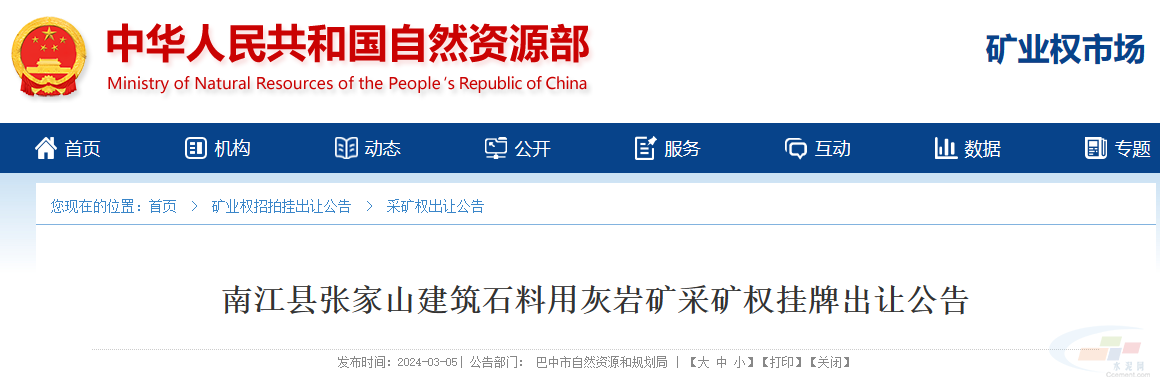 3月5日,巴中市自然資源和規劃局發布公告,掛牌出讓四川省巴中市南江縣張家山建筑石料用灰巖礦采礦權,擬出讓28.7年,起始價5387.42萬元。