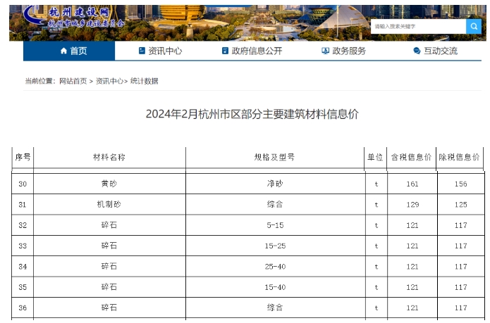近日,杭州市城鄉建設委員會發布2024年2月杭州市區部分主要建筑材料信息價。2月,杭州市黃砂(凈砂)161元/噸、機制砂129元/噸、碎石121元/噸(均為含稅信息價)。