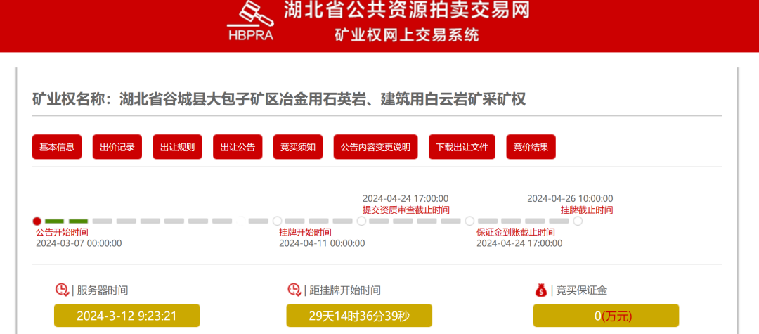 本次采礦權掛牌出讓在湖北省公共資源拍賣交易網礦業權網上交易系統(https://www.hbggzypm.cn 以下簡稱交易系統)上進行,意向競買人可登錄該系統瀏覽、下載掛牌出讓相關文件。