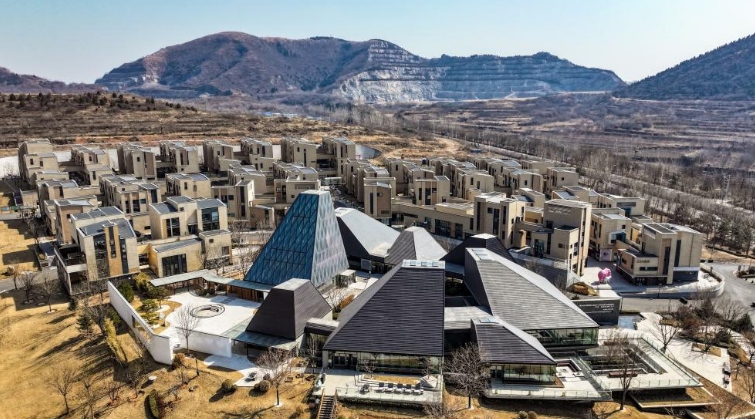 礦后,近乎垂直的大片裸露創傷崖壁與周邊郁郁蔥蔥的綠色植被形成鮮明對比,成為當地生態修復的一大難題。近年來,薊州區陸續關停了數百家污染企業,大力開展廢棄礦坑和山體修復,將多個歷史遺留礦區納入治理范圍。如今,曾經的峭壁被修整成平緩的坡面,山體逐漸被新綠覆蓋,處處透露著綠色發展理念,“eden春山里”生態教育國際生活示范區(以下簡稱“春山里”)就在這里落成。