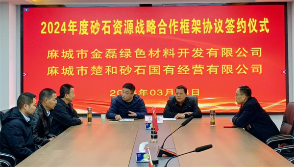 2024年3月13日,湖北麻城市楚和砂石國有經營有限公司與金磊綠色材料開發有限公司簽訂砂石資源戰略合作框架協議。雙方擬從“產業聯盟合作、物流運輸合作、黃砂貿易合作”三方面進行優勢互補,形成信息共享機制,提升各自企業盈利能力及市場占有率。擴大資源優勢成為利益共同體,探索對口重點項目形成貿易直供,打造麻城區域“資源產業聯盟”。