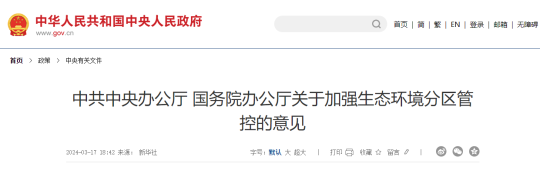 2024年3月17日,《中共中央辦公廳 國務院辦公廳關于加強生態環境分區管控的意見》(以下簡稱《意見》)公開發布。其中明確:到2025年,生態環境分區管控制度基本建立,全域覆蓋、精準科學的生態環境分區管控體系初步形成。到2035年,體系健全、機制順暢、運行高效的生態環境分區管控制度全面建立,為生態環境根本好轉、美麗中國目標基本實現提供有力支撐。